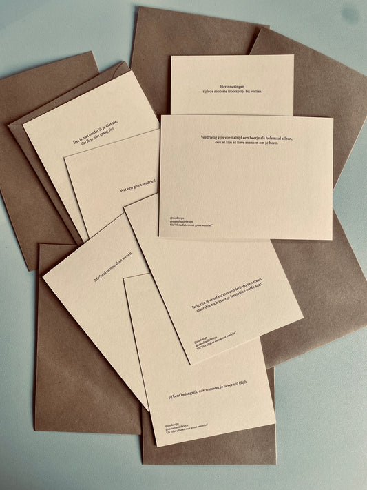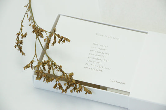 Welkom op deze warme webshop. Zoek je wat houvast, uitleg of troost? Dan zit je goed! Je vindt hier cadeautjes om te geven of te houden, cadeautjes om van te houden. Boeken om te koesteren, te doorbladeren, te lezen en te herlezen. Boeken met illustraties die raken. Kaartjes ook want #erisnognooiteenkaartjeteveelgeschreven. Zachtheid in de vorm van zeep en zakdoeken. Bijeenkomsten om samen te rouwen en te troosten. Samenwerkingen, want samen kom je verder dan alleen. De informatie over de rouwreizen vind je ook onder 'collabs'.